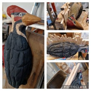 This woodpecker carving didn’t fair well in the outdoors, so he came back to the shop for some TLC. Bit of a process, but ready
