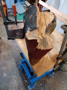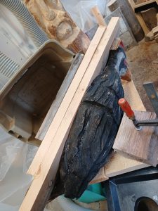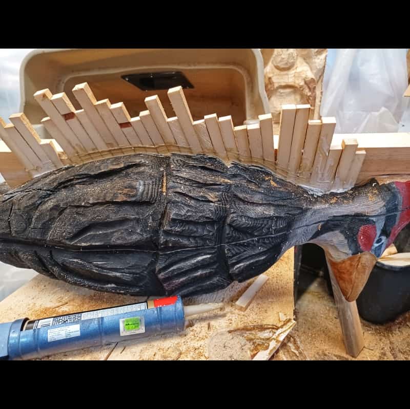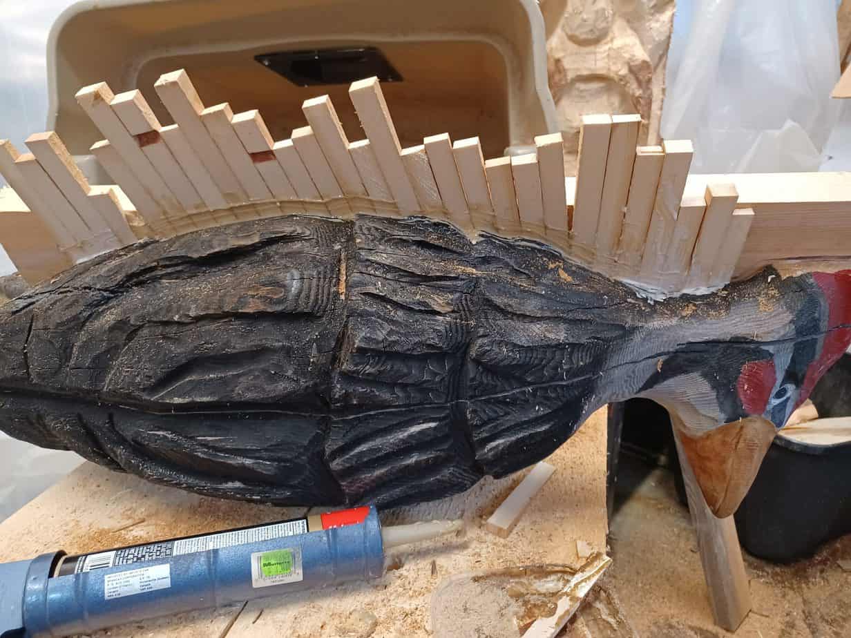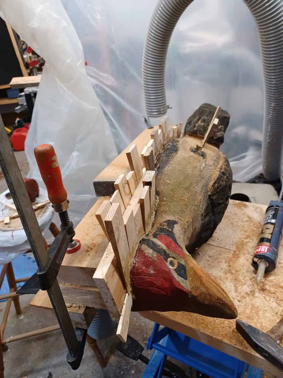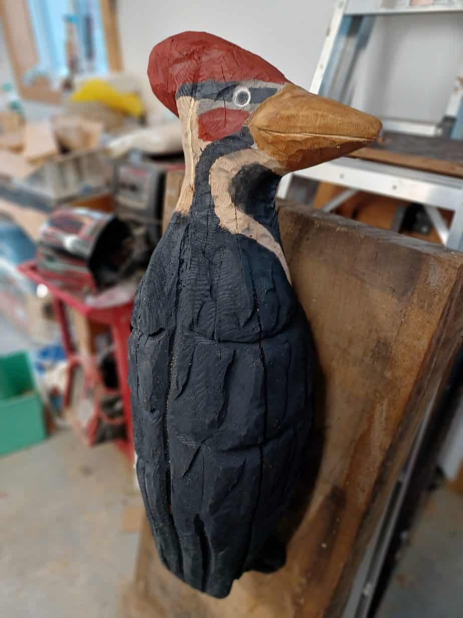 This woodpecker carving didn’t fair well in the outdoors, so he came back to the shop for some TLC.
