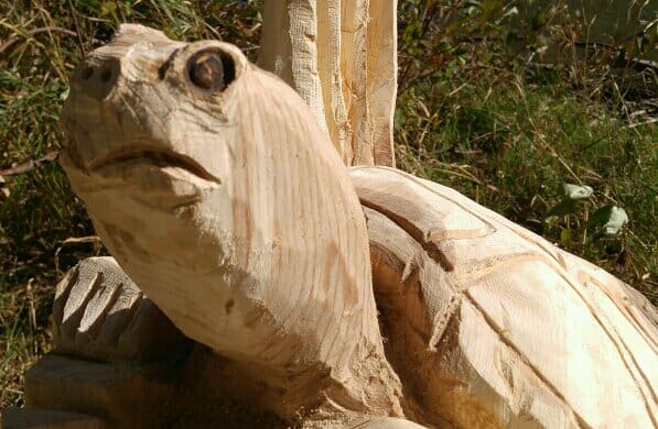 This was a challenge for two reasons; 1/ the tree was three stumps that separated about 2 feet above the ground and 2/ I wanted a realistic sculpture of a snapping turtle that only a mother snapping turtle could love.?:-)