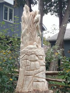 This is a white ash stump that was carved to a marshland. Includes red-winged blackbirds, cat-tails and a loon on water. Located in Southampton.